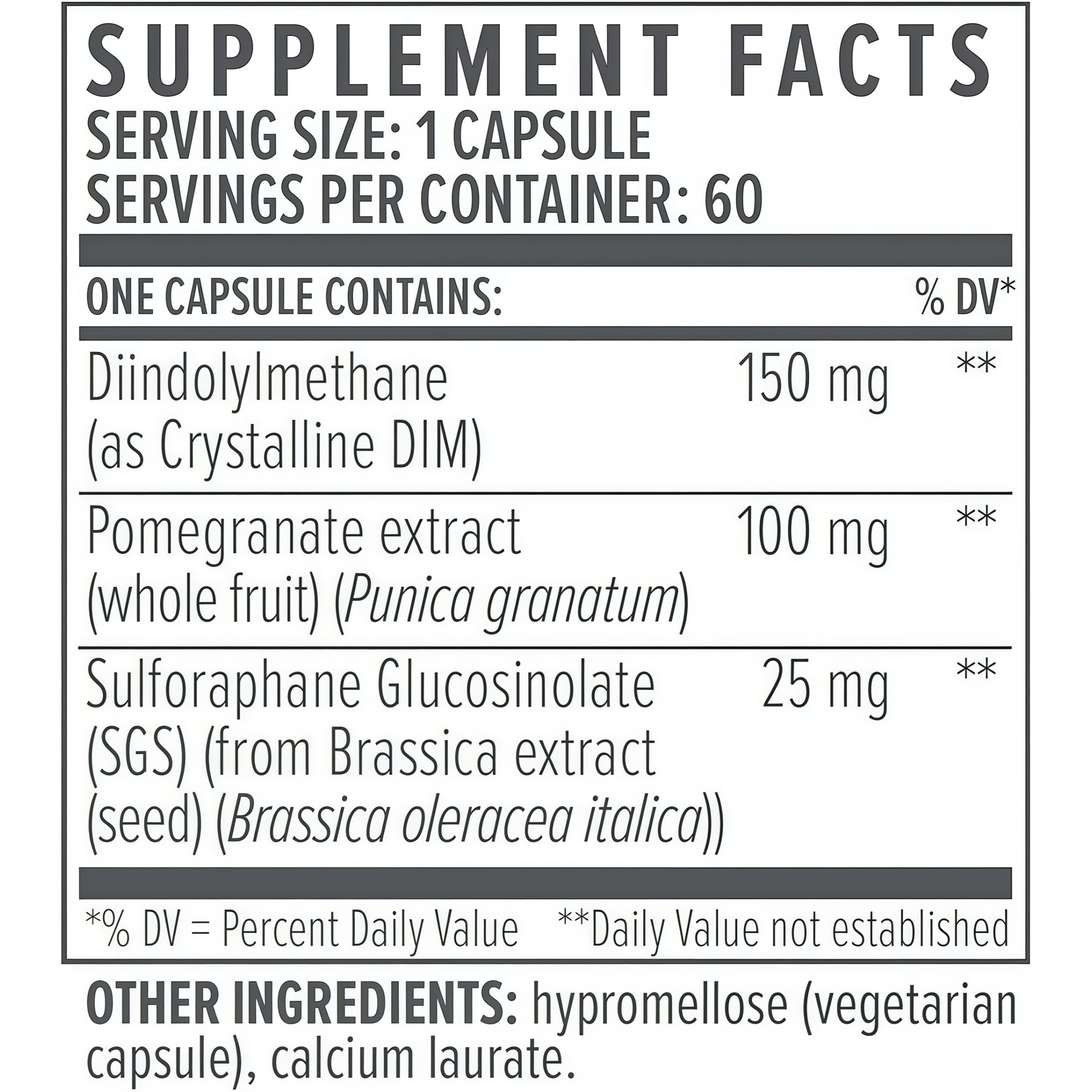- Diindolylmethane (DIM) - 150mg per capsule, derived from cruciferous vegetables like broccoli, cabbage, and kale